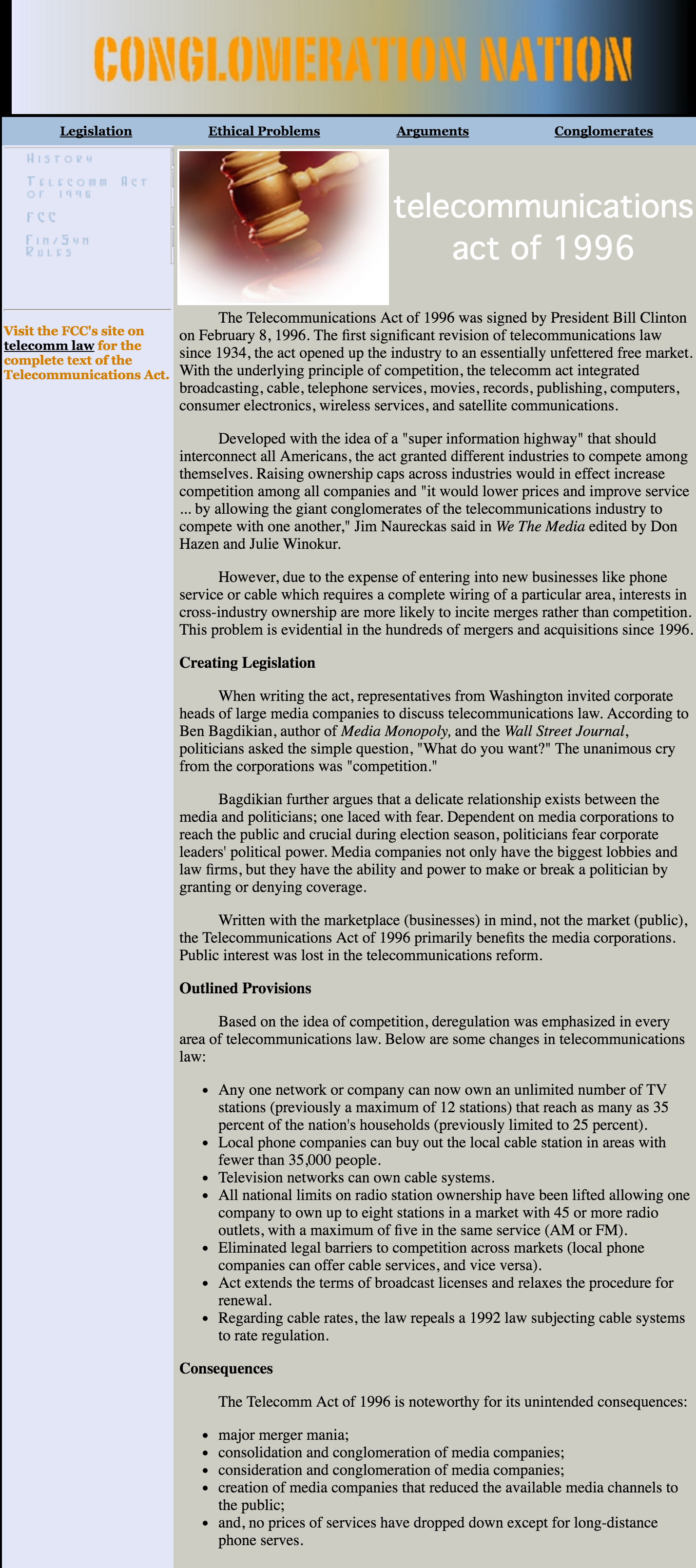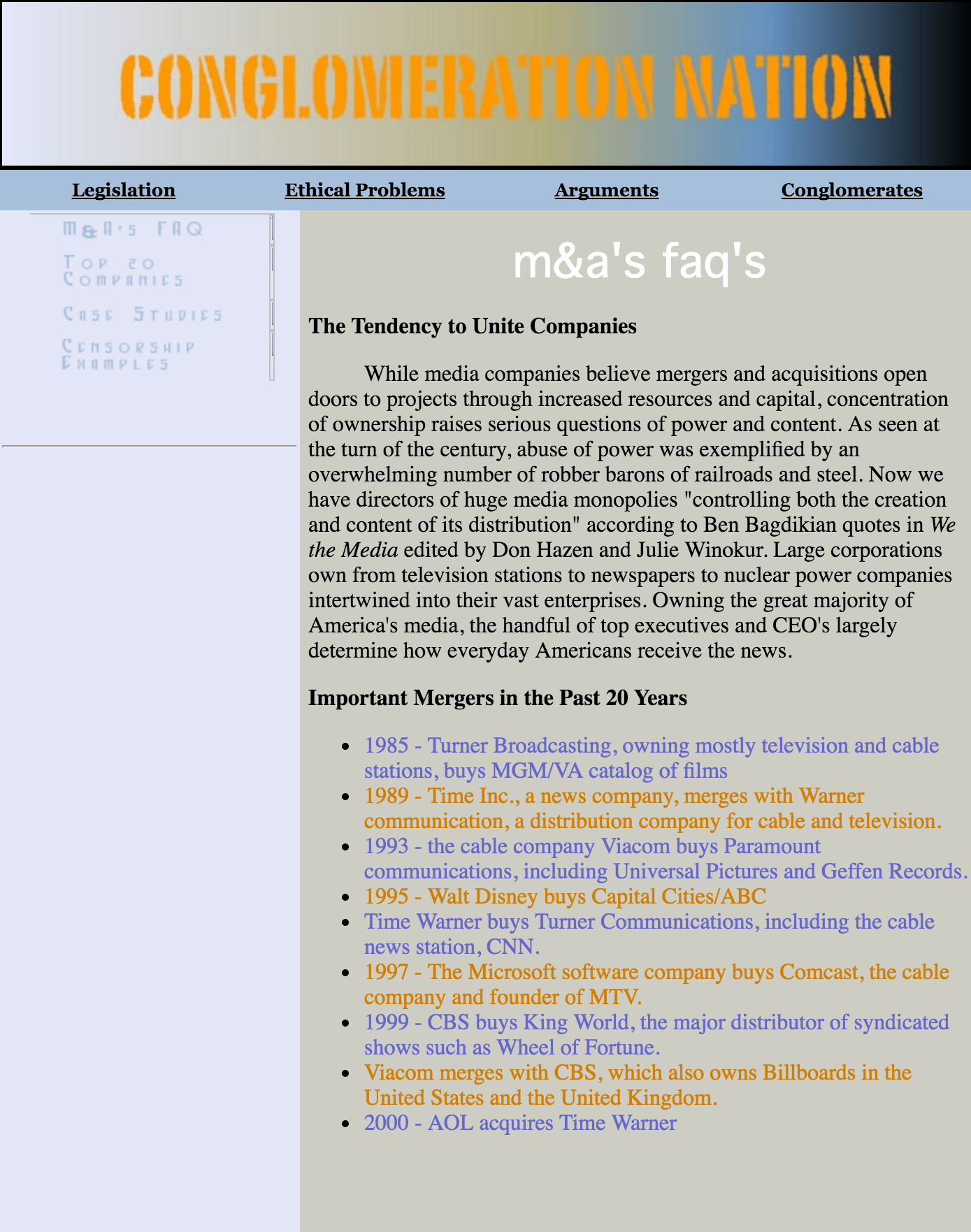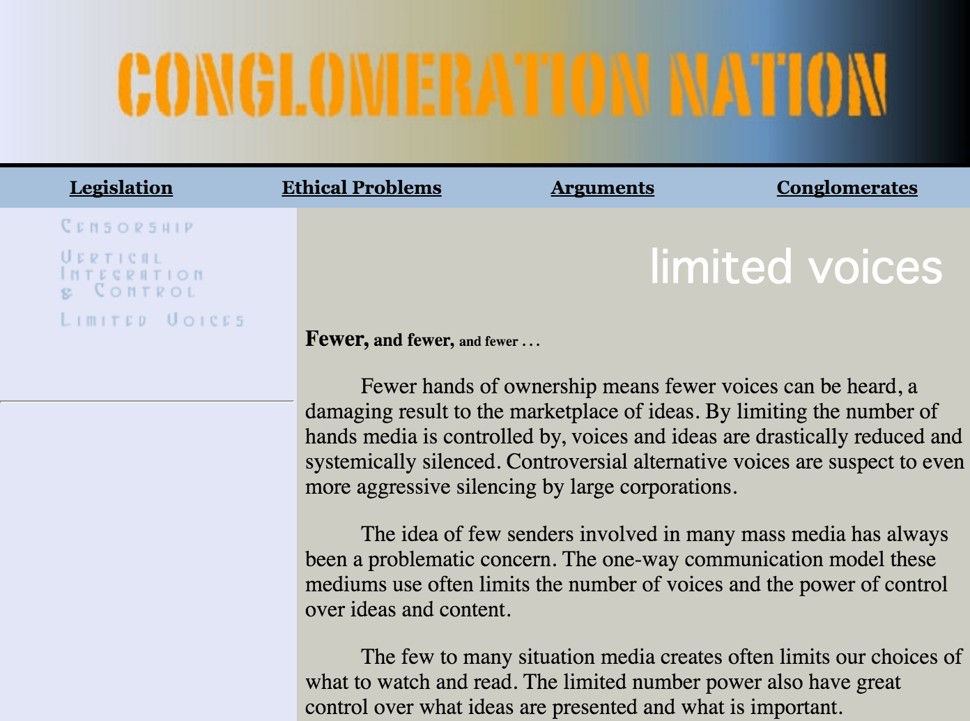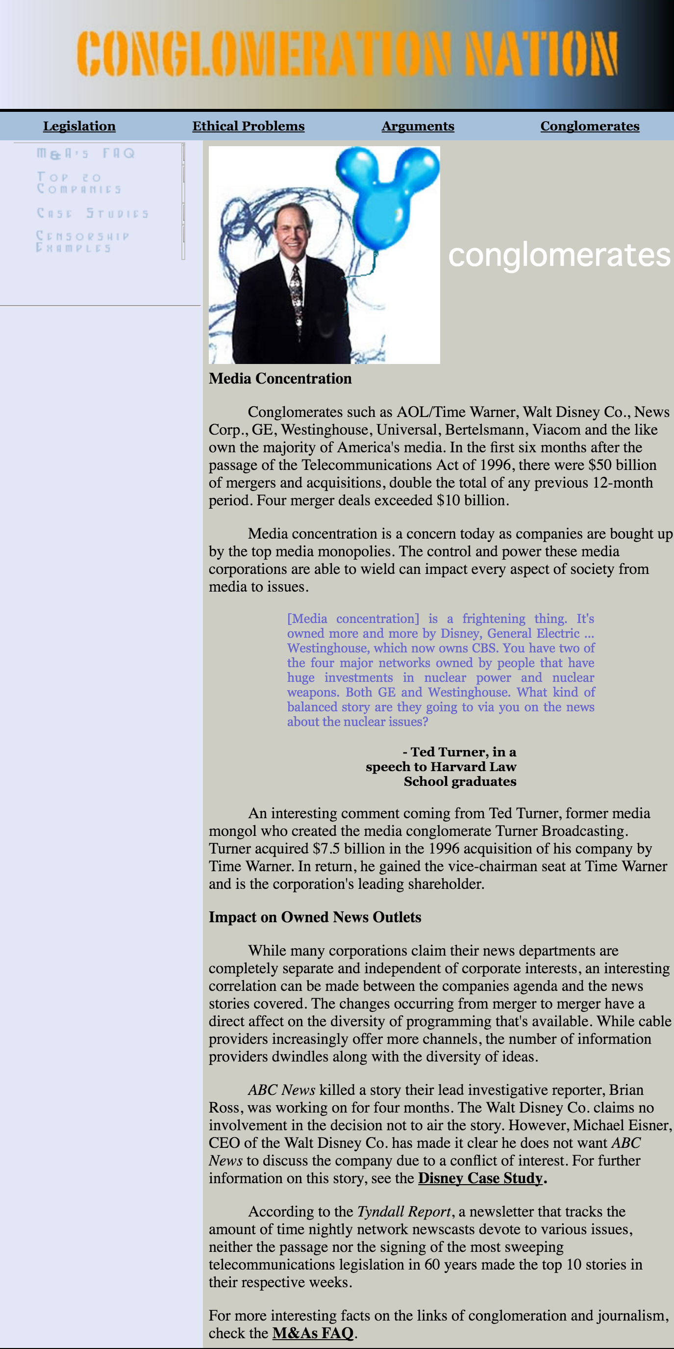 “Conglomeration Nation” was a college website project that explored media conglomerates, legislation and ethical considerations. Using Dreamweaver, the site was built to be a resource website.