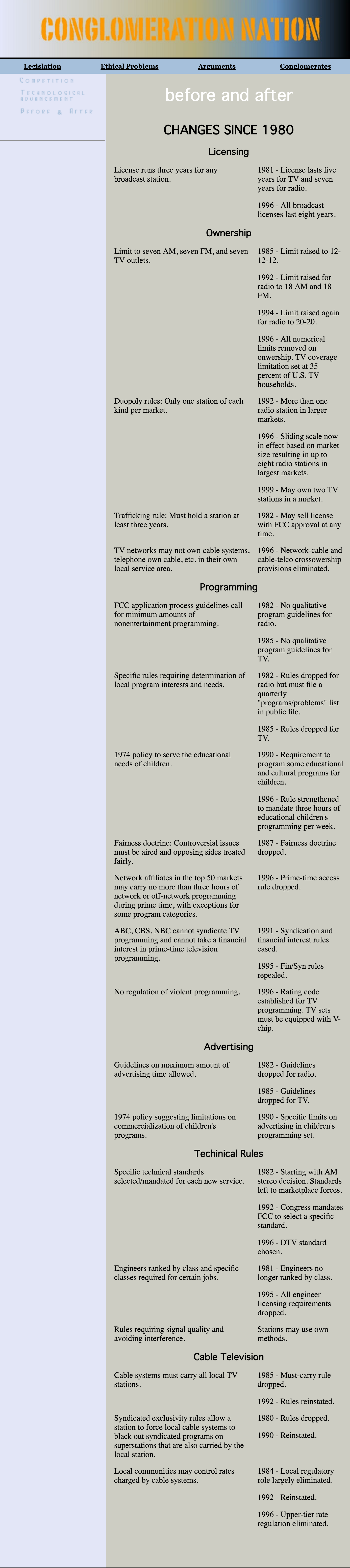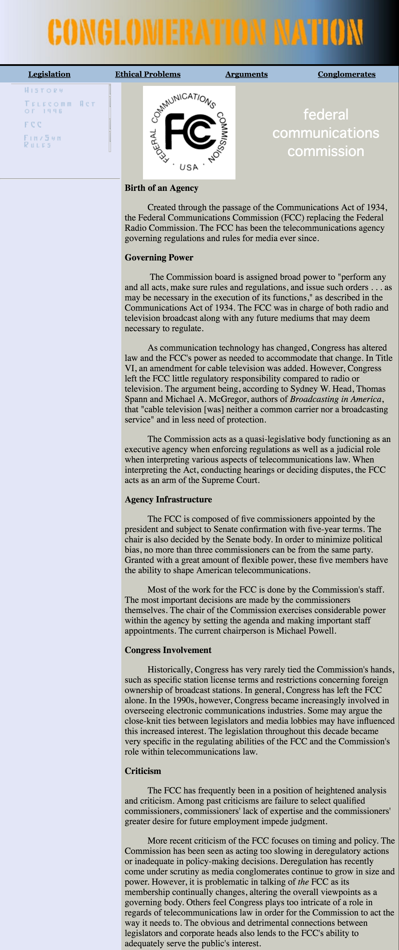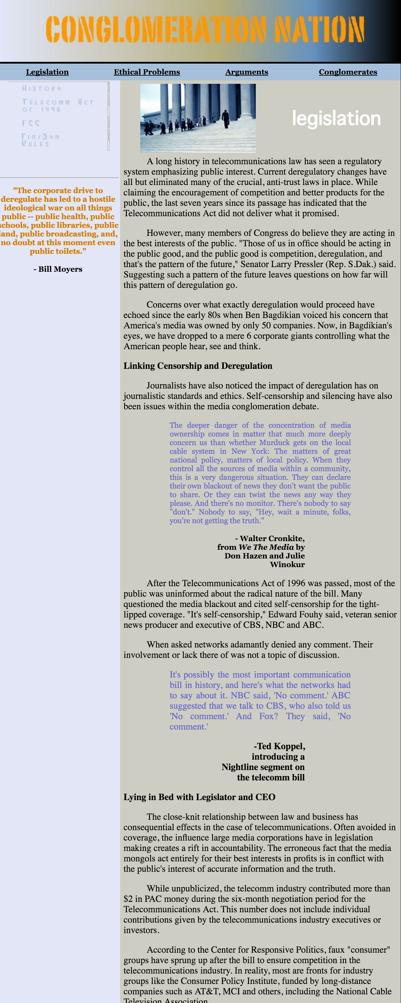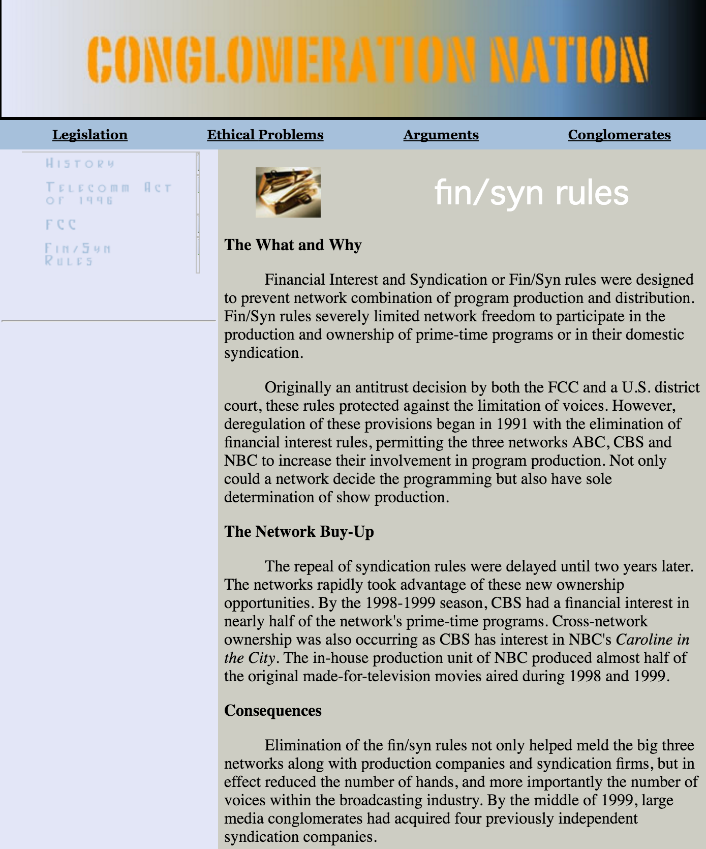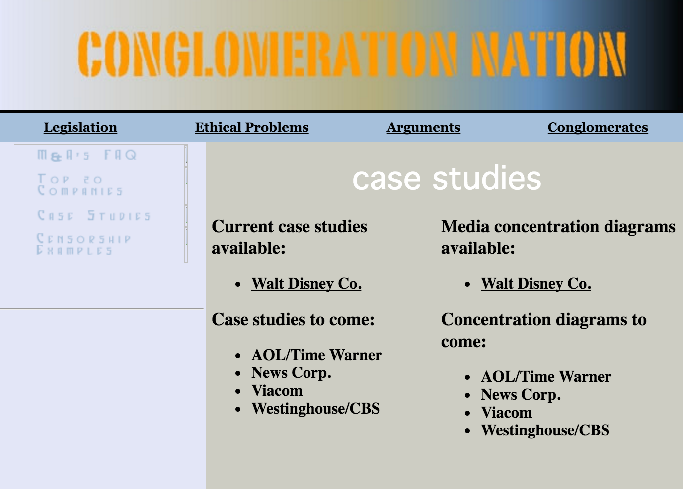“Conglomeration Nation” was a college website project that explored media conglomerates, legislation and ethical considerations. Using Dreamweaver, the site was built to be a resource website.