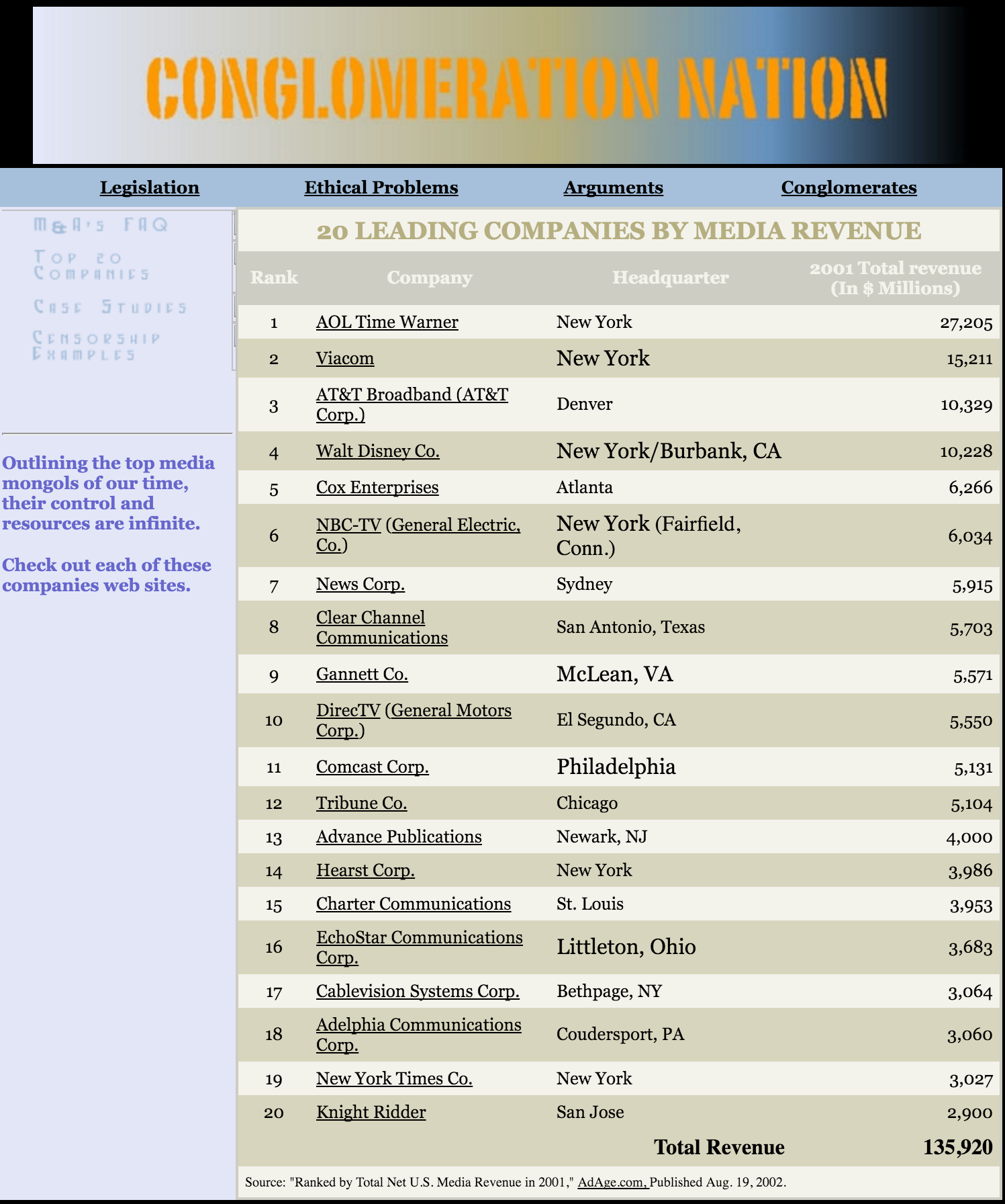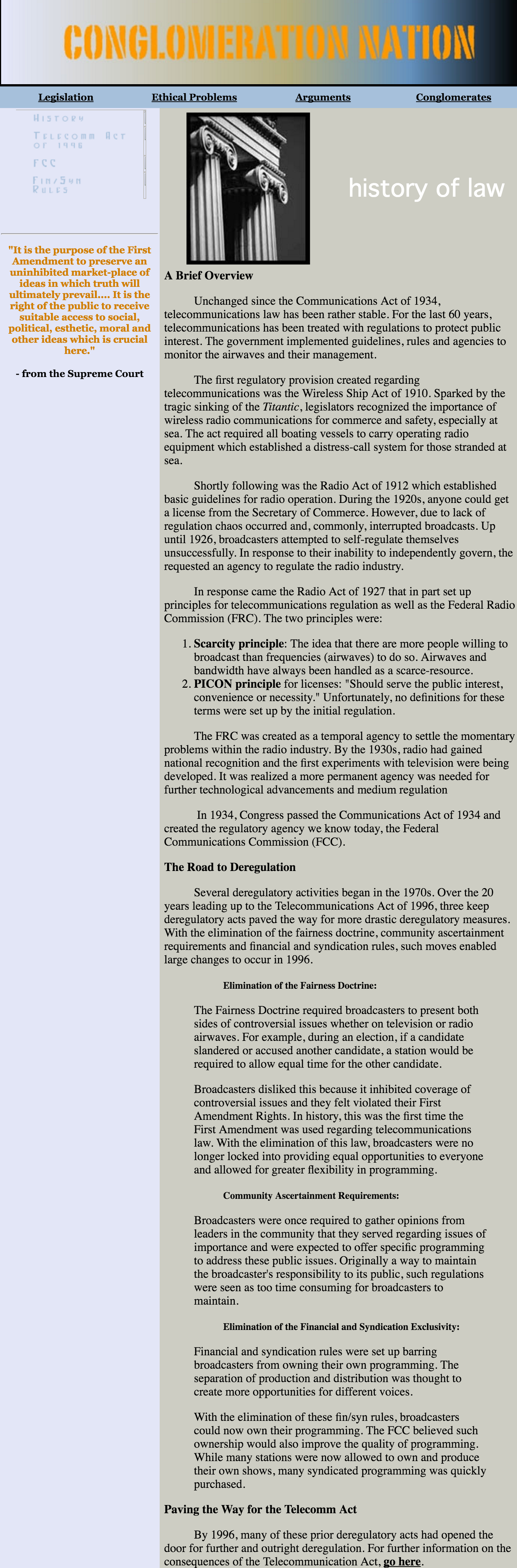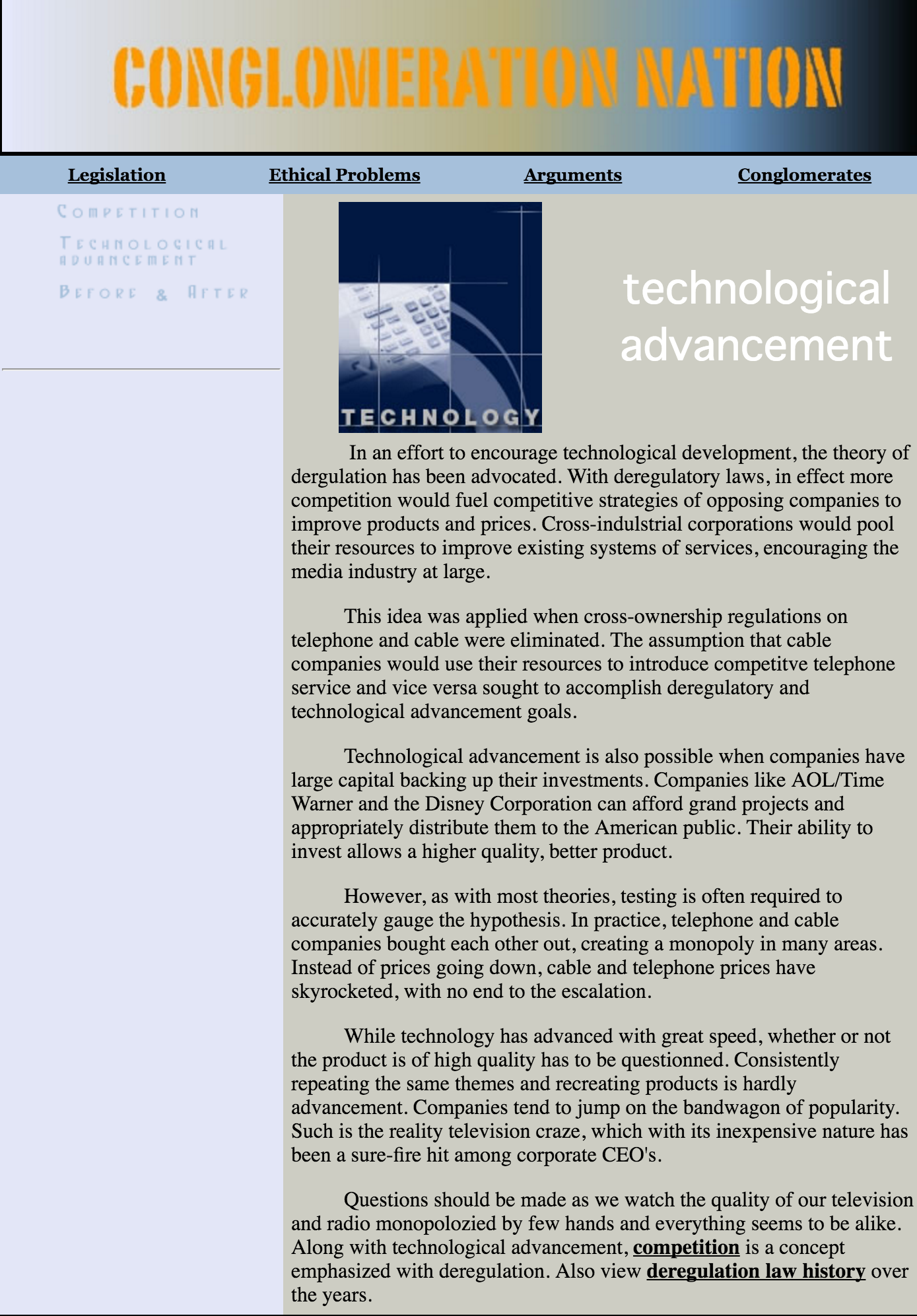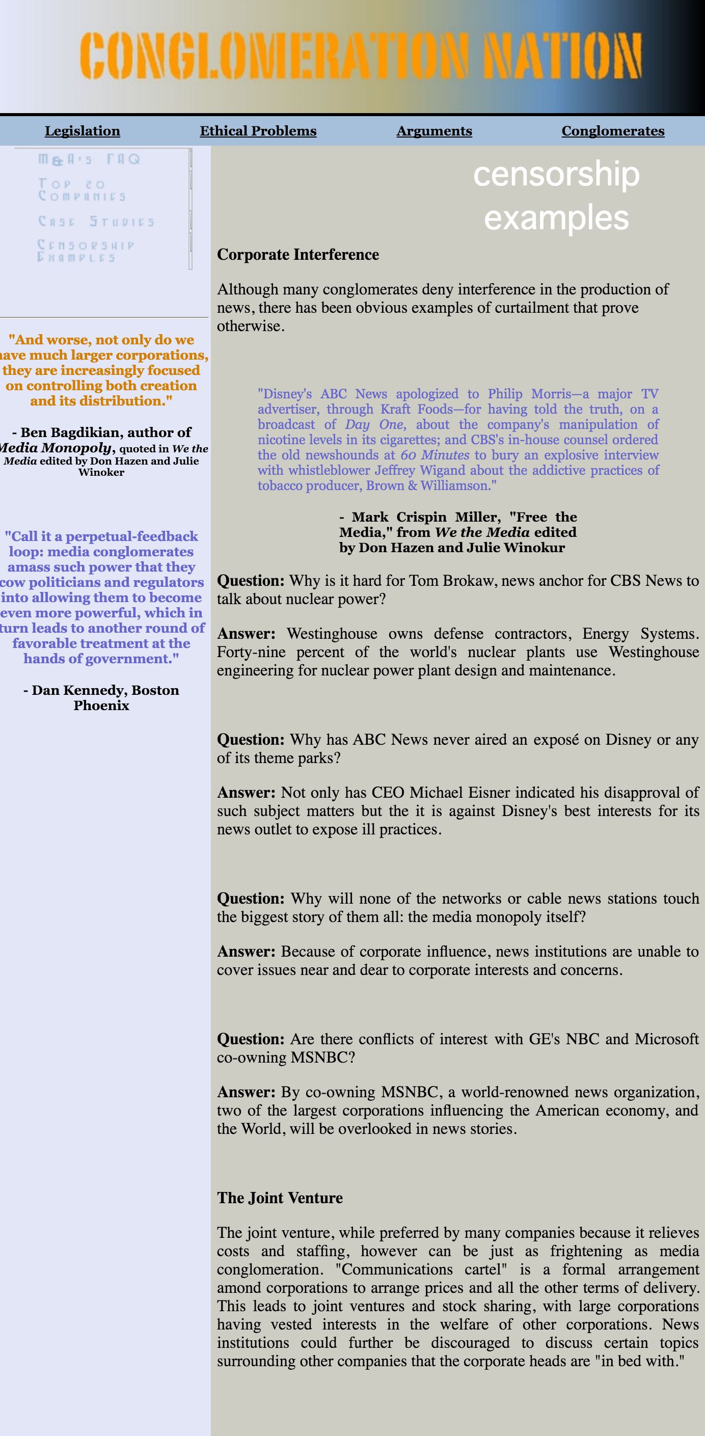 “Conglomeration Nation” was a college website project that explored media conglomerates, legislation and ethical considerations. Using Dreamweaver, the site was built to be a resource website.